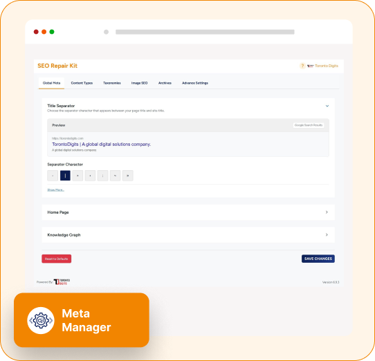 Meta Manager gives you full control over your websiteโs SEO metadata directly in WordPress. It lets you easily manage titles, descriptions, robots settings, and SEO templates for posts, pages, taxonomies, and archives. With dynamic SEO variables, search preview, and seamless integration with Gutenberg and Elementor, it helps optimize every page for better visibility in search results.